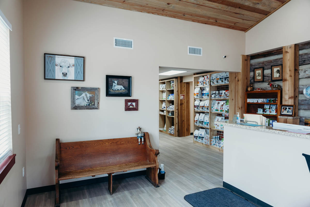 ommercial office expansion integrating a historic log cabin with new board and batten wood construction and a bright red metal roof.