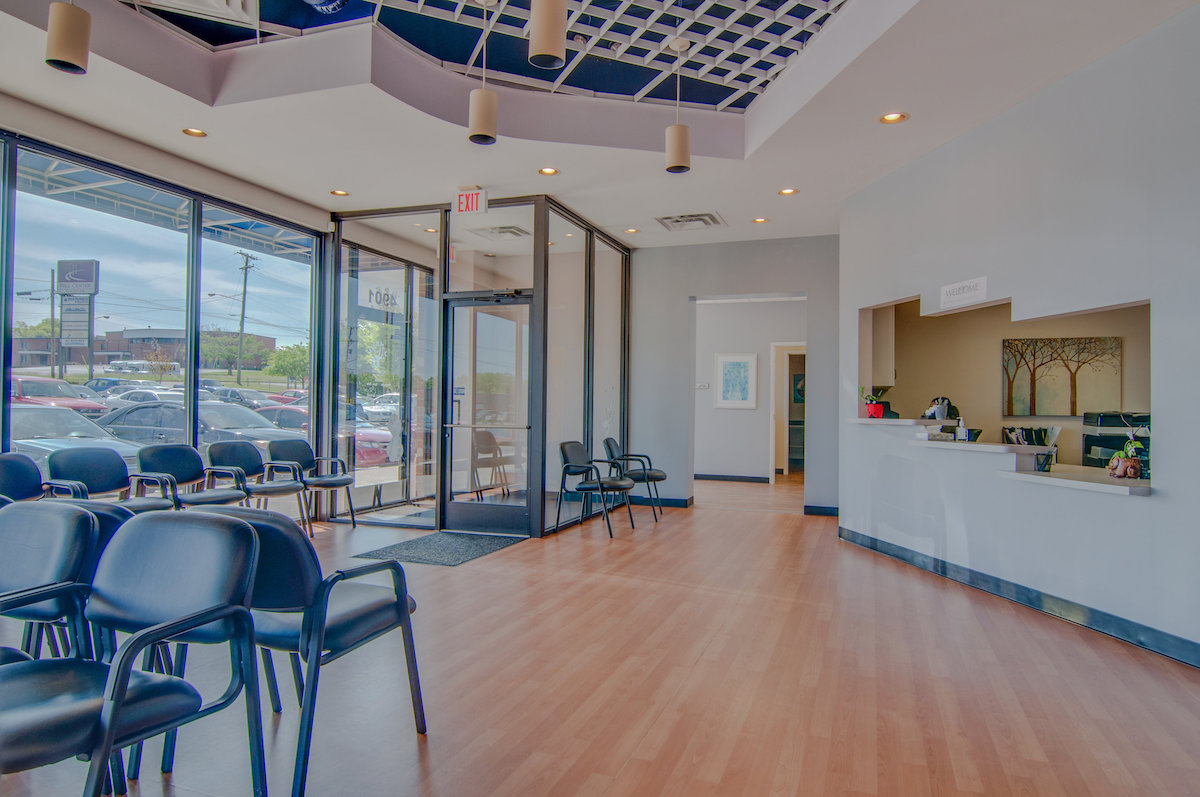 A modern office waiting area with comfortable chairs and a view of the outdoors.