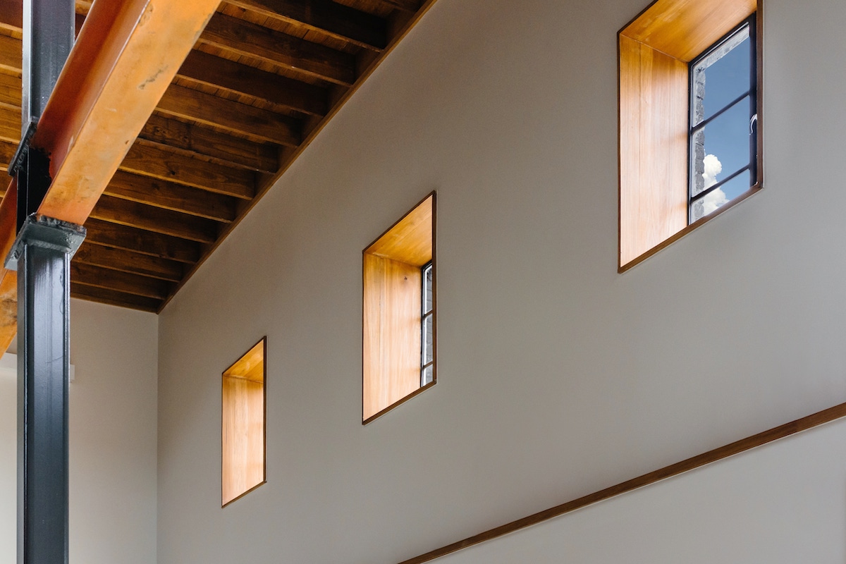 Three uniquely shaped windows in a modern interior with a wood ceiling.