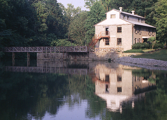 A photo of an old stone mill with a water wheel, reflected in a calm pond. A wooden bridge leads to the mill, which is surrounded by tall trees.