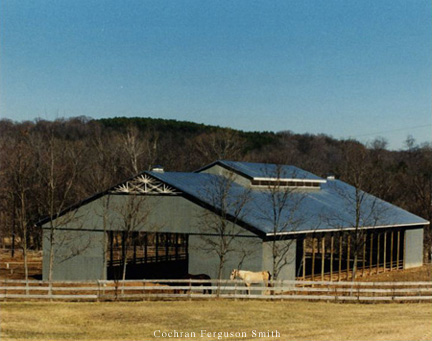 A photo of a large horse barn with a metal roof and many windows.