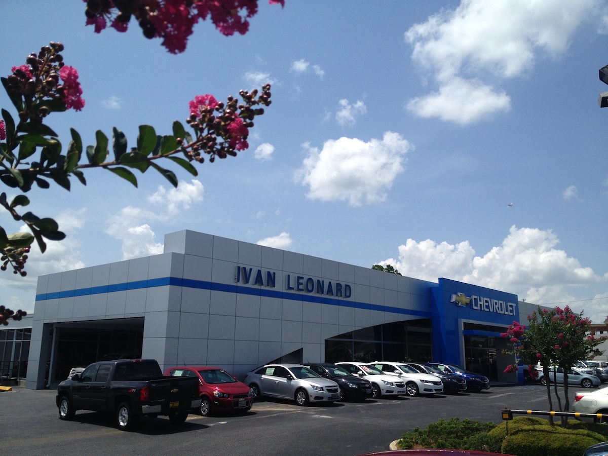 A car dealership with a blue and white building, a red car in the foreground, and a blue sky with clouds in the background.